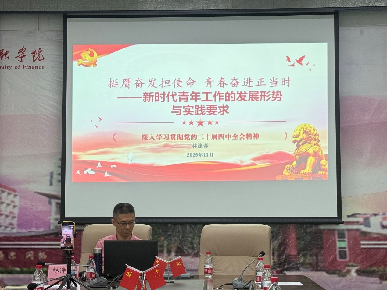 会议第一议题聚焦学习贯彻党的二十届四中全会精神。广东工业大学数学与统计学院党委副书记、广东省首批青年讲师团成员林逢春教授作专题报告。他围绕新时代青年工作的战略意义、机遇挑战与实践要求,系统解读了党的二十届四中全会关于“十五五”时期发展的宏伟蓝图,深入阐释了新质生产力的内涵特征及其对青年发展的支撑作用。